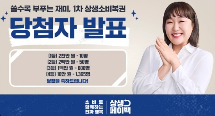 중소벤처기업부는 따뜻한 소비를 응원하기 위해 추진한 1차 상생소비복권의 당첨 결과를 상생페이백 누리집(상생페이백.kr)에 6일 공개했다.